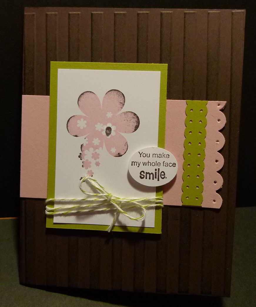 The Early Espresso card base was embossed with the Stripes Textured Impressions Embossing Folder and antiqued with the Mahogany stain from the Distressing Essentials Kit.