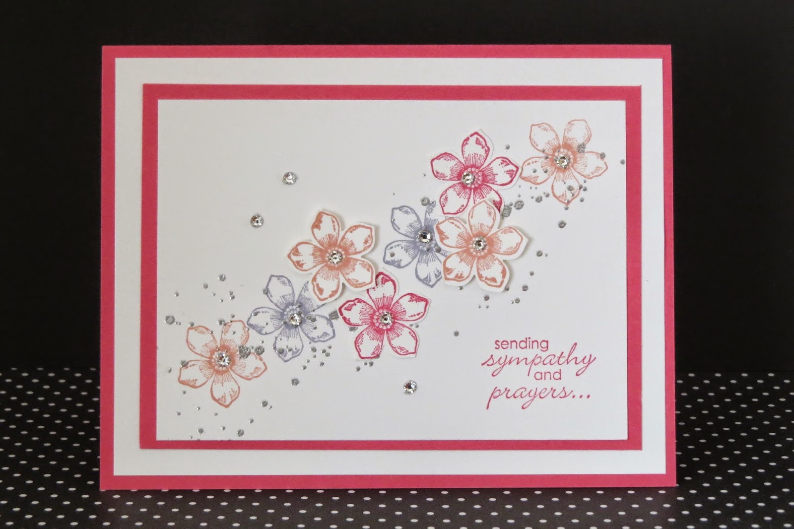 The colors are Crisp Cantaloupe, Wisteria Wonder and Strawberry Slush. The stamp sets are Petite Petals and Gorgeous Grunge. The gorgeous Grunge image was embossed with Silver embossing powder. Lots of Rhinestones add sparkle to the card.
