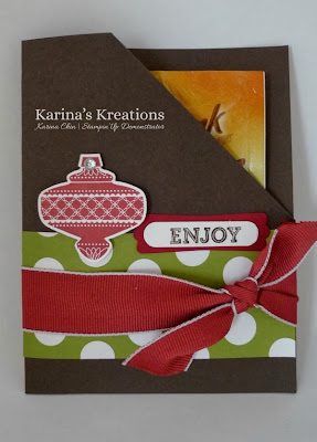 I used 5-1/2″ x 8-1/2″ Early Espresso card stock scored at 4-1/4″ and scored at the right hand corner. I folded the right hand corner down and secured it with a glue dot.