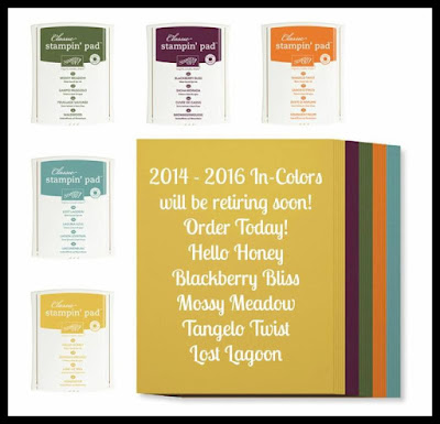 I want to remind everyone that there is 5 colors retiring when the next catalog comes out. Make sure to stock up on the re-inkers, card stock and markers for Hello Honey, Lost Lagoon, Blackberry Bliss, Tangelo Twist and Mossy Meadow before April 1. They sell out really fast.