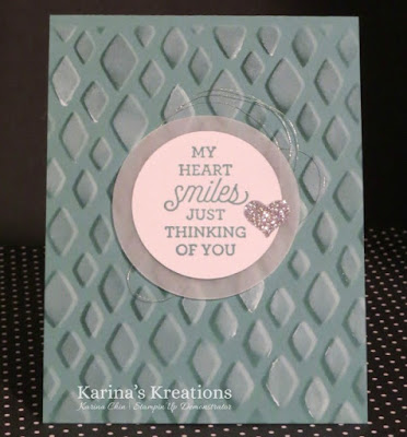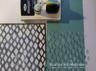 I placed the diamond stencil over Lost Lagoon card stock and sponged Lost Lagoon ink onto the card base. I moved the mask over a smidge and went over the mask with Whisper White craft ink. This is the fun effect you get.