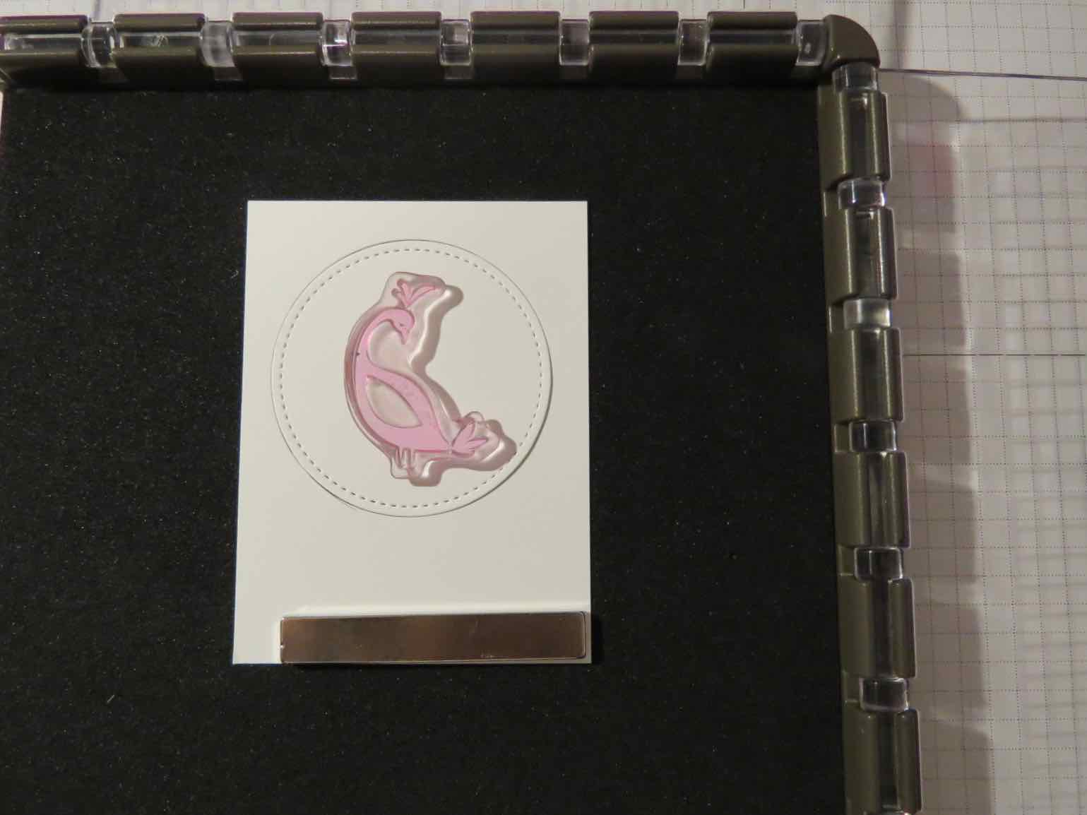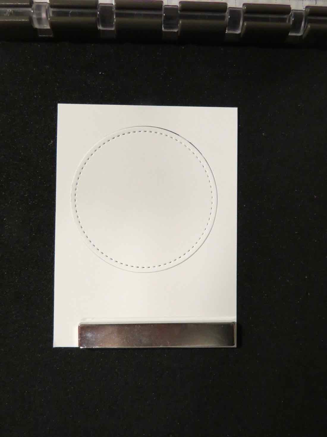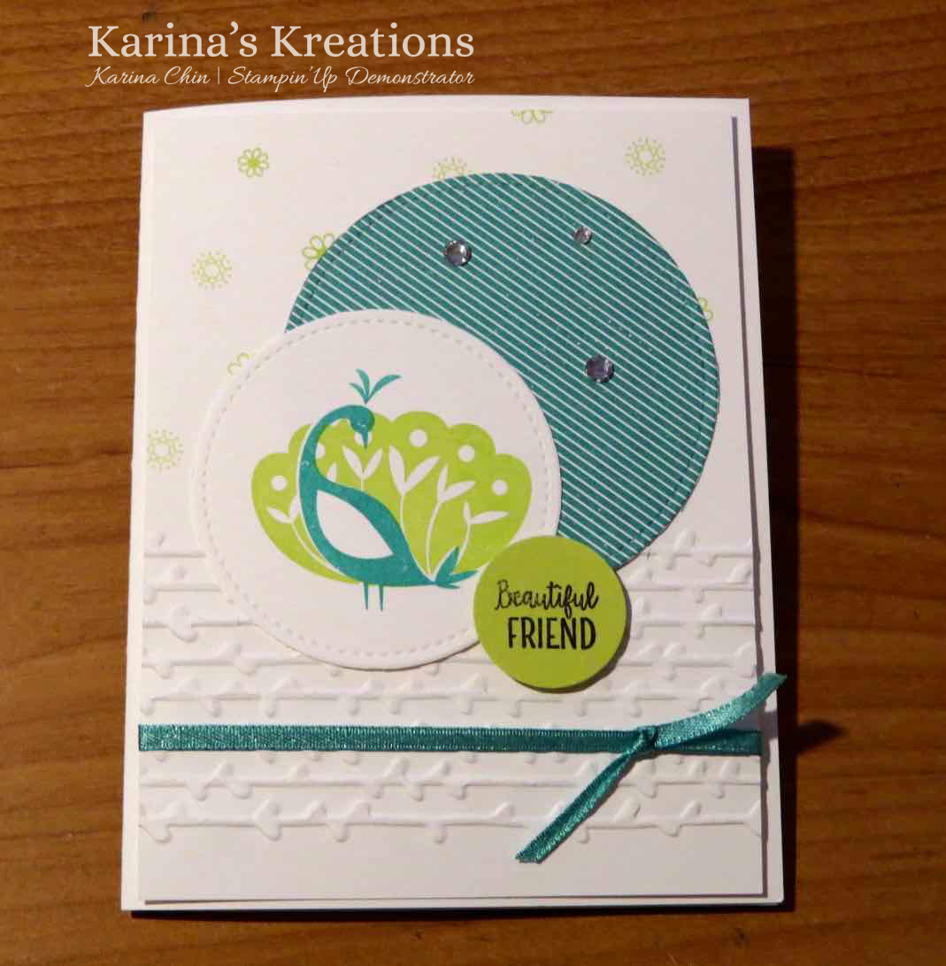 Here’s a few tips for you. I made this card for a swap and needed 11 peacocks. I made a template from 3″ x 4″ card stock and cut out the circle using the Stitched Shapes framelit die. I cut all my circles in the Big Shot, two layers at once and then these were the steps to stamp them.