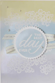 The flower images were stamped on glossy card stock with versamark ink and embossed with Whisper White embossing powder.  I sponged So Saffron, Marina Mist and Wisteria Wonder ink over the embossed image.  It gives the image a soft pastel hue. isn’t it pretty?