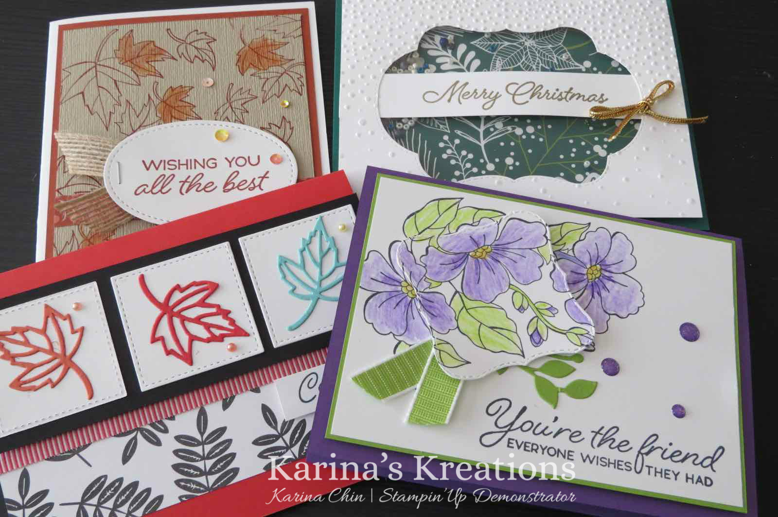 The cards all use the Stampin’Up Blended Seasons bundle. When you purchase the Blended Seasons stamp set and Stitched Seasons die, you will save 10% and earn a $6 bonus coupon to use in September.