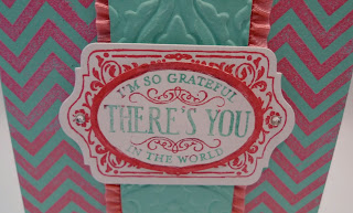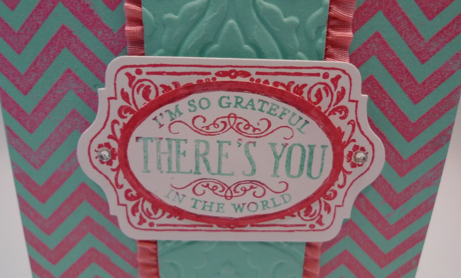 I bought the new Positively Chevron stamp set # 130499 and just had to use it!!! The stamp was inked up with Versamark ink and embossed with Melon Mambo Stampin’ Emboss Powder #123223.