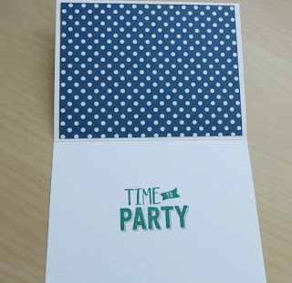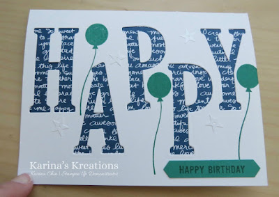 I used thick White card stock as my base and then cut out happy using the framelits. I placed Dapper Denim Designer Series Paper behind the cut out greeting.