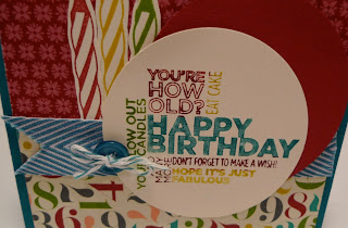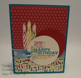 I used a bunch of new products on my card but my favorite is the new Cycle Celebration stamp set #130273. I love the candle images!!!
