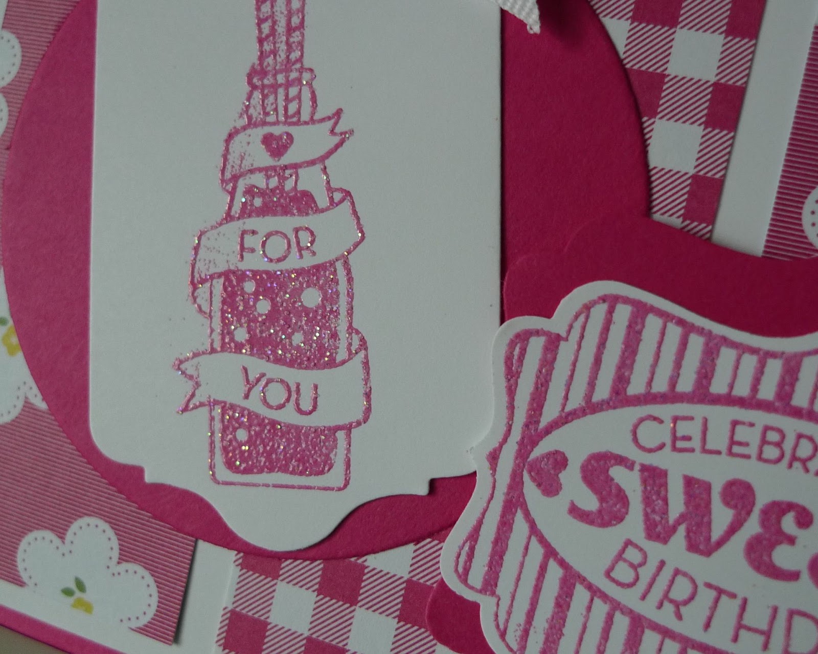 This is one of the cards this month. I used a technique on this card called Mixed Embossing. I combined Irridescent Ice and Melon Mambo Embossing powders and embossed the bottle and greeting images. Can you see the sparkle?
