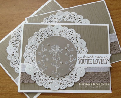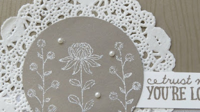 I stamped the Flowers from Flowering Fields with Versamark ink on Tip Top Taupe card stock and embossed it with a blend of Whisper White Embossing Powder and Dazzling Diamonds glitter. It looks iridescent up close.