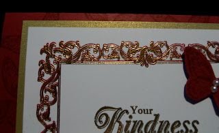 The frame was stamped with Raspberry Ripple ink on Whisper White card stock. I stamped the same image again with VersaMark Ink using a stamp-a-ma-jig to line it up.  Gold embossing powder was poured over part of the image and set with a Heat Tool.