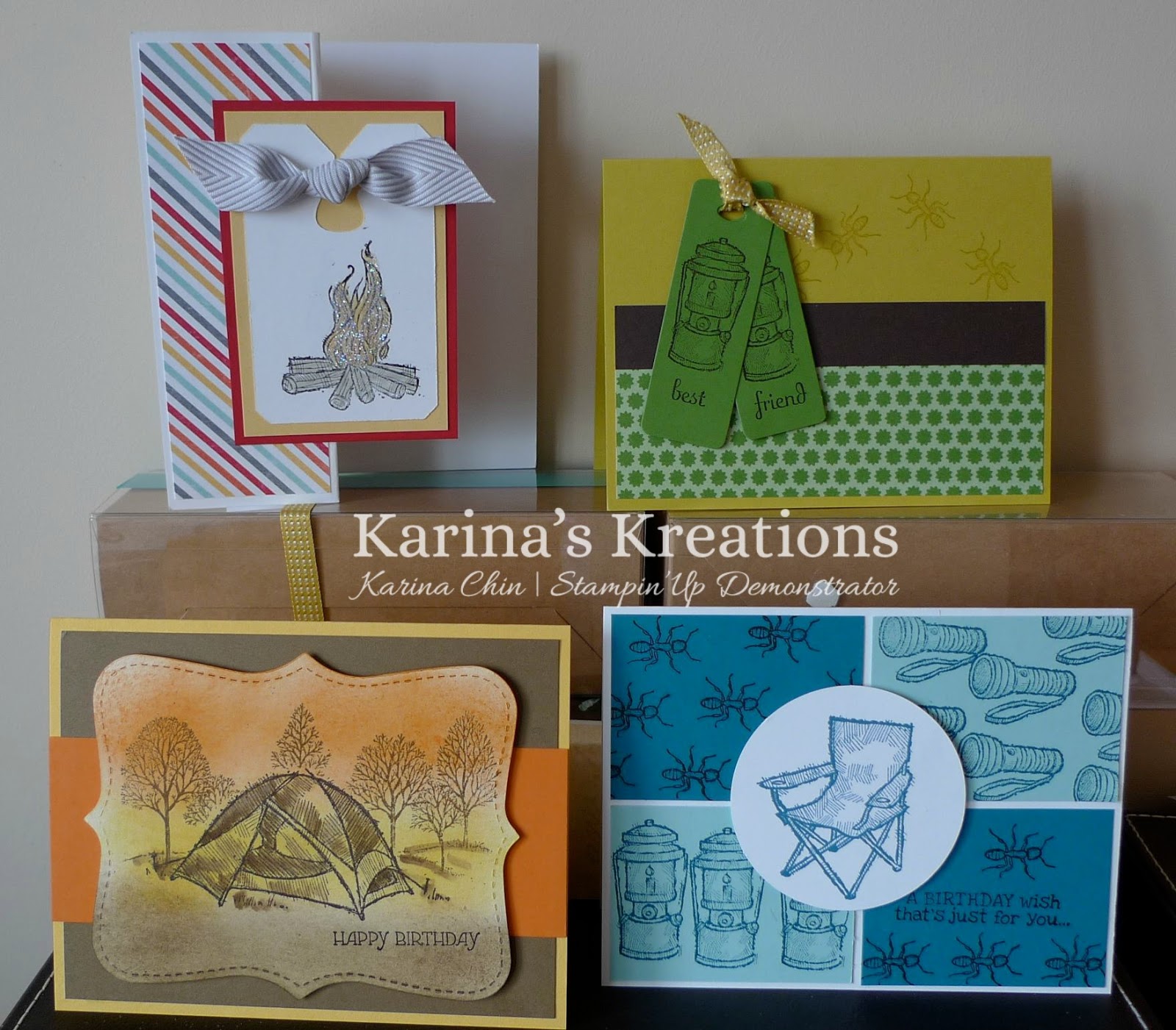 Do you have bored kids at home? Let me entertain them for 2 hours on Wednesday August 14 and they will make these 4 cute cards and go home with the their own Great Outdoors stamp set. The cost is $30.00.