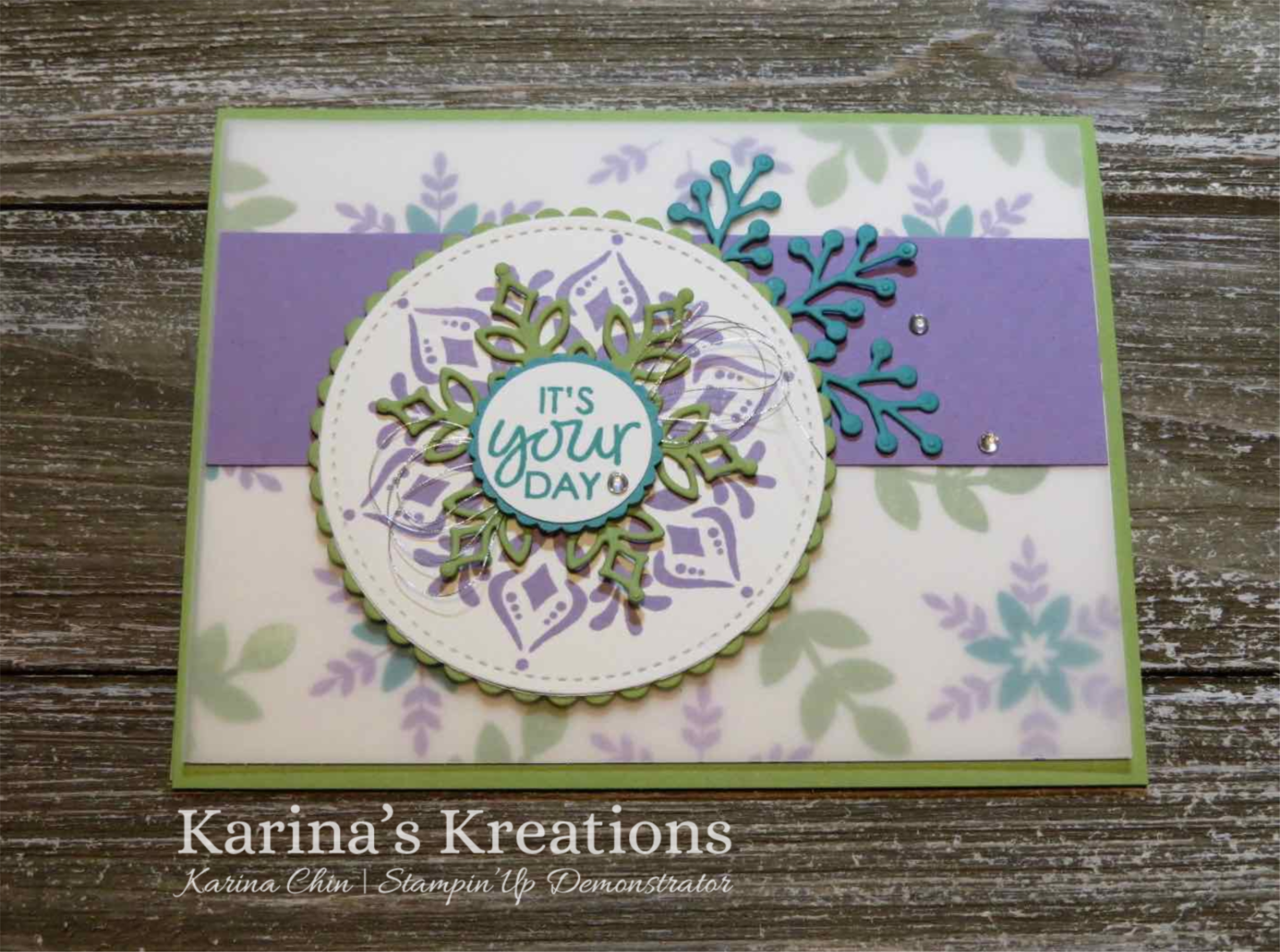 I created my own designer series paper by randomly stamping the images on Whisper White card stock with Highland Heather, Pear Pizzazz and Bermuda Bay Ink.  I placed a layer of vellum card stock over top to soften the look.