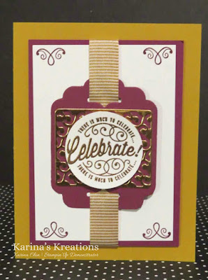 The card stock colors are Delightful Dijon, Rich Razzleberry and Whisper White. I used copper embossing powder, #141636 and copper foil #142020 on my projects.