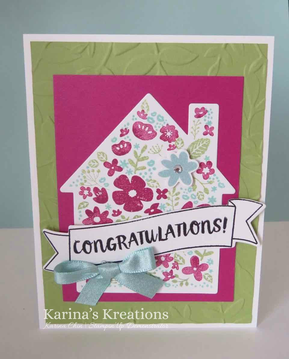 It’s a three step stamp set which means I stamped the first image with Berry Burst ink, the second image with Pool Party ink and the third image with Pear Pizzaz ink. The images line up to make a house.