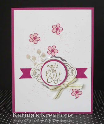 I added some Berry Burst Ribbon and a left over stamped image from the label Me Pretty stamp set and Pretty Label Punch and made this card.