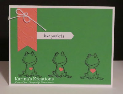 I stamped the frog three times on Cucumber Crush card stock and added a slightly bigger heart on each frog. I used the Confetti Hearts border punch and the Classic Label punch on this card.
