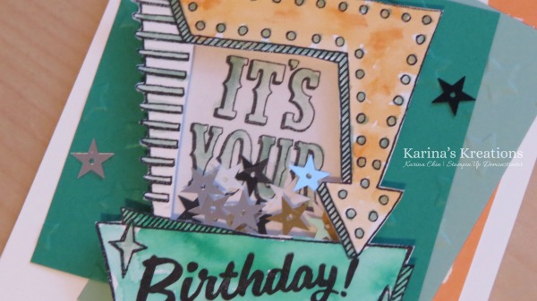 This card is a shaker card and I used Emerald Envy, Peach Parfait and Mint Macaron for my card stock and ink colors.