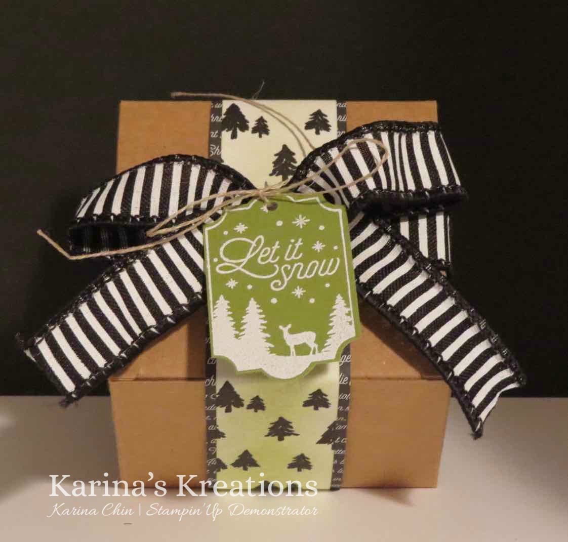 The paper is part of the Merry Little Christmas Designer Series Paper #144621. The ribbon is 7/8″ Striped Ribbon #144624.