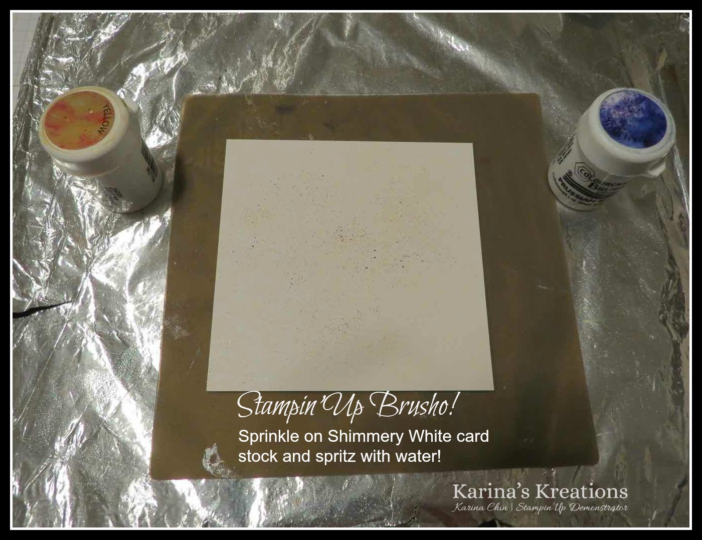 I started with a piece of 3-1/2″ x 3-3/4″ Shimmer White card stock. I sprinkled on Yellow and Prussian Blue Brusho Crystal Colors on the paper and spritzed with water. This was the result. Isn’t it pretty?