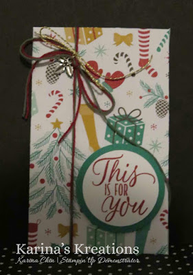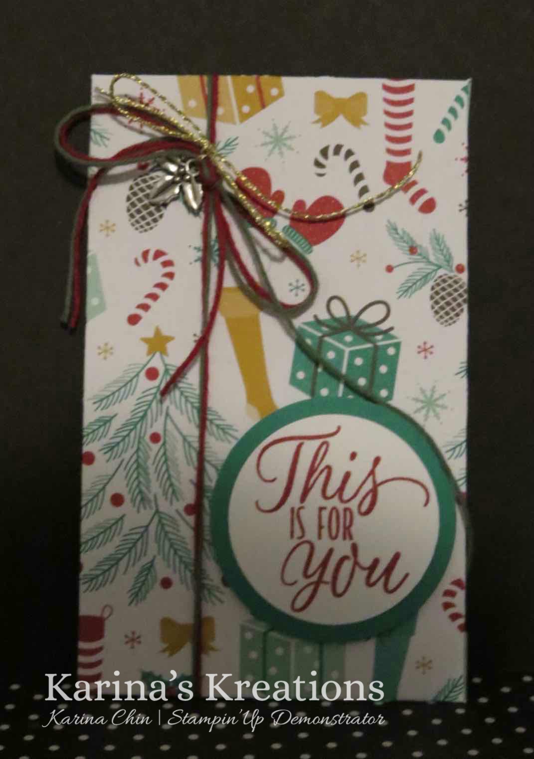 The gift card holder is made with the Presents and Pinecones Designer Series Paper #141986, Christmas Trinkets Embellishments #141997, Baker’s Twine Trio Pack #141999 and the Tin of Tags Stamp Set #142180.