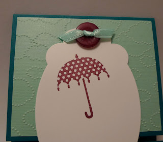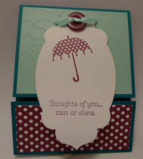 One of my favorite stamp sets from the mini catalog is Rain or Shine #126777. I love these umbrella images. My stamp set is packed up and ready for my Buy One Get One Free Sale on May 31 so luckily I found this cute swap card that I could share with you. Sorry but I don’t who created it!