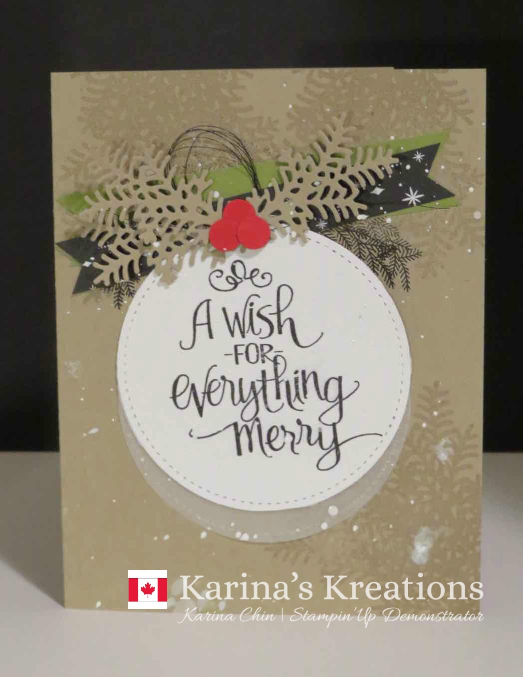 The only tricky part to the card was creating the splash of snow. I placed a drop of Whisper White re-inker on a wax paper, added a few drops of water and splashed the ink onto the card with an aquapainter. It was messy but I love the look.