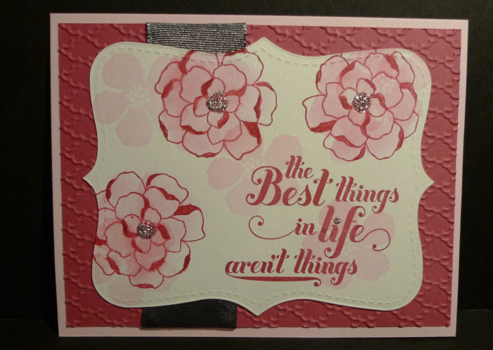 I’m showing you a cute card made by Selene Kempton. I got it as a swap in Orlando and I love the colors and how she used the Basic Gray/Basic Black 1-1/4″ Two Toned Ribbon.
