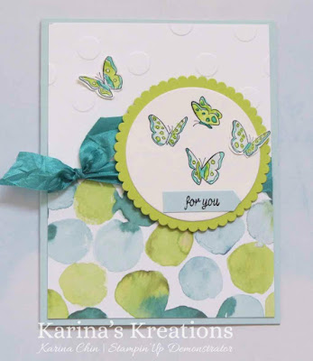 I used the Naturally Eclectic Designer Series Paper #144815, Emerald Envy Crinkle Ribbon #144190, Polka Dot Basics Embossing Folder #143709 and the Layering Circles Dies #141705.