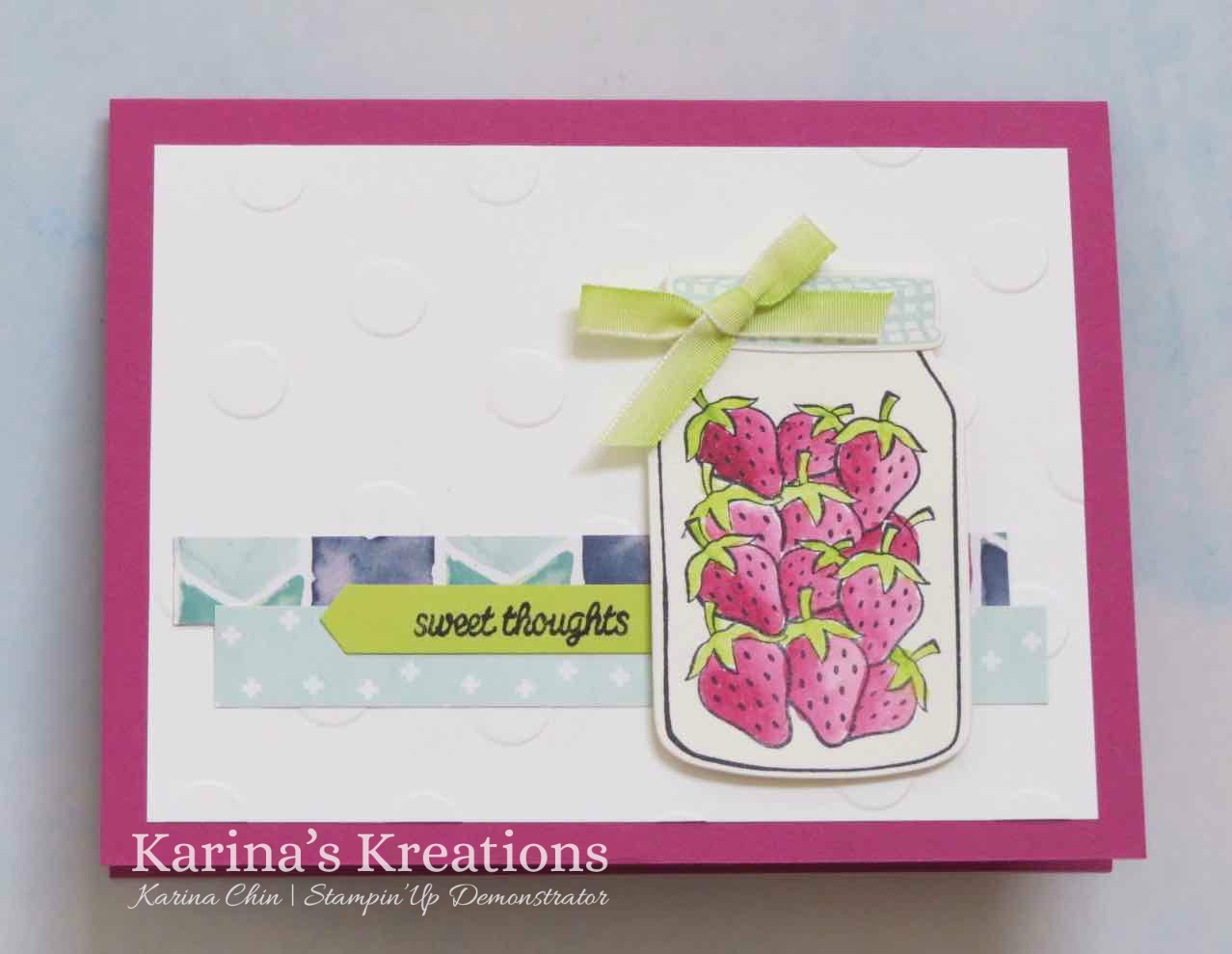 The strawberries were stamped once and then covered with a mask I made from a post it note and stamped a second time. They were colored in with classic ink and an aquapainter.