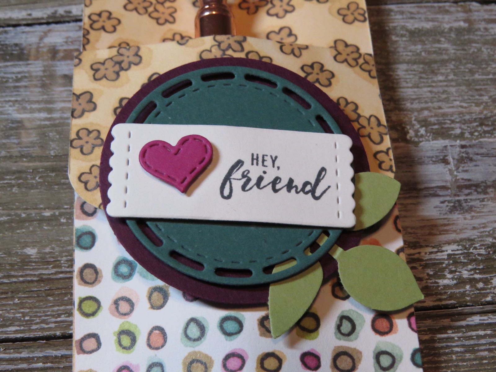 She used the Share What You love Designer Series paper cut at 2-1/2″ x 12″, scored at 1-1/2″ and 6″creating a pocket. The pocket was sealed with Tear and Tape adhesive.