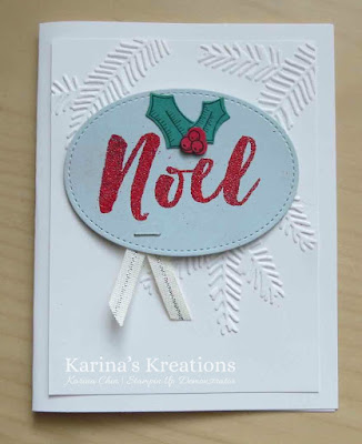 I used the same oval shape from the Stitched Shaped Framelits and Soft Sky card stock however, this time I used the Christmas Pines stamp set #142049. Christmas Pines is on sale for 25% off until Nov 30!