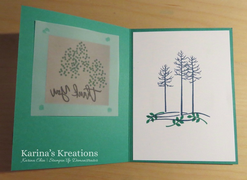 The leaves and greeting were stamped on Vellum card stock and the tree image is stamped on the inside of the card.
