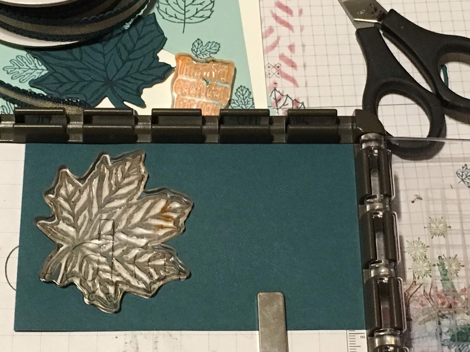 I am making 18 of these cards and have a tip for you. I find it’s faster if I die cut the leaf image first then place it in my stamp a ma jig to stamp the image.