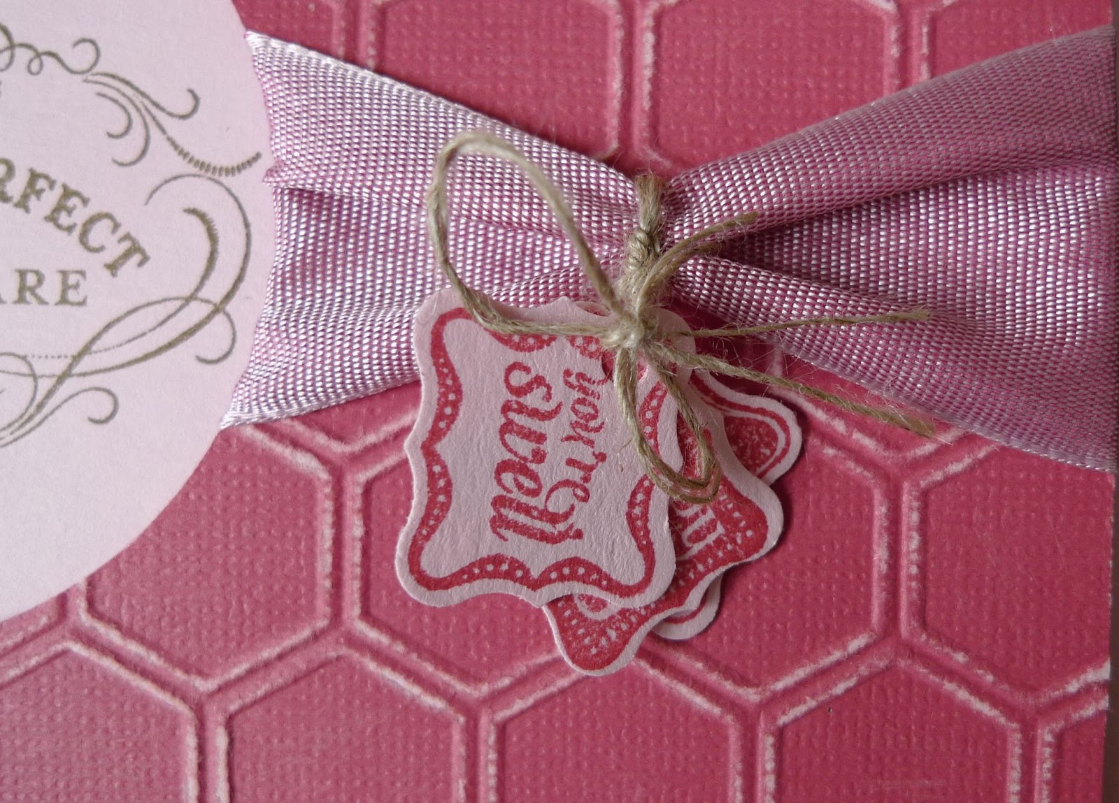What do you think of this card? I was trying to use the Pink Pirouette/Rose Red 1-1/4″ Two Toned Ribbon #129294 in another way and came up with this design. It’s pretty simple but has a big wow factor by using the Primerose Petals Core’dinations card stock # 129322 , the Stampin Sanding Block #129367 and the Honeycomb Textured Impressions embossing Folder #129378.