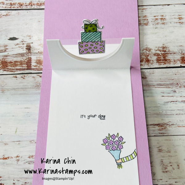 I added a pop up surprise to the inside of my card. The inside measurement for the pop-up section is 3-3/8″ x 9-1/2″ scored at 1″, 2-3/4″ and 4-1/2″.