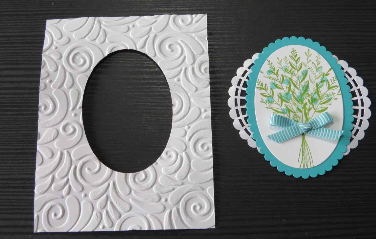 2) To save some card stock, stamp the flower image in the middle of Whisper White card stock and cut with the Oval framelit. Attach it to a scallop oval shape and attach over the hole with Stampin’ Dimensionals. You can’t even see where the image was cut out. What do think?