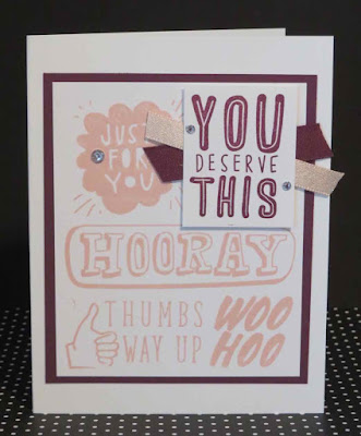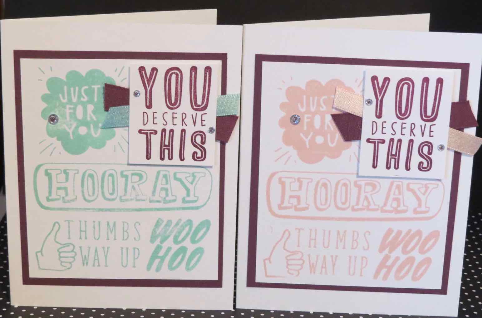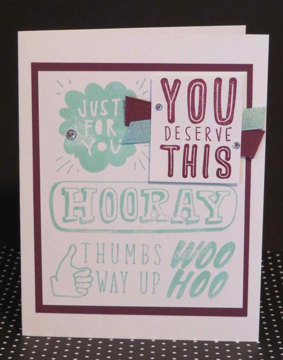 Stanpin’Up has a fun new stamp called You Deserve This #143916. The image on this card is one image and then you can highlight the greeting you want to use.