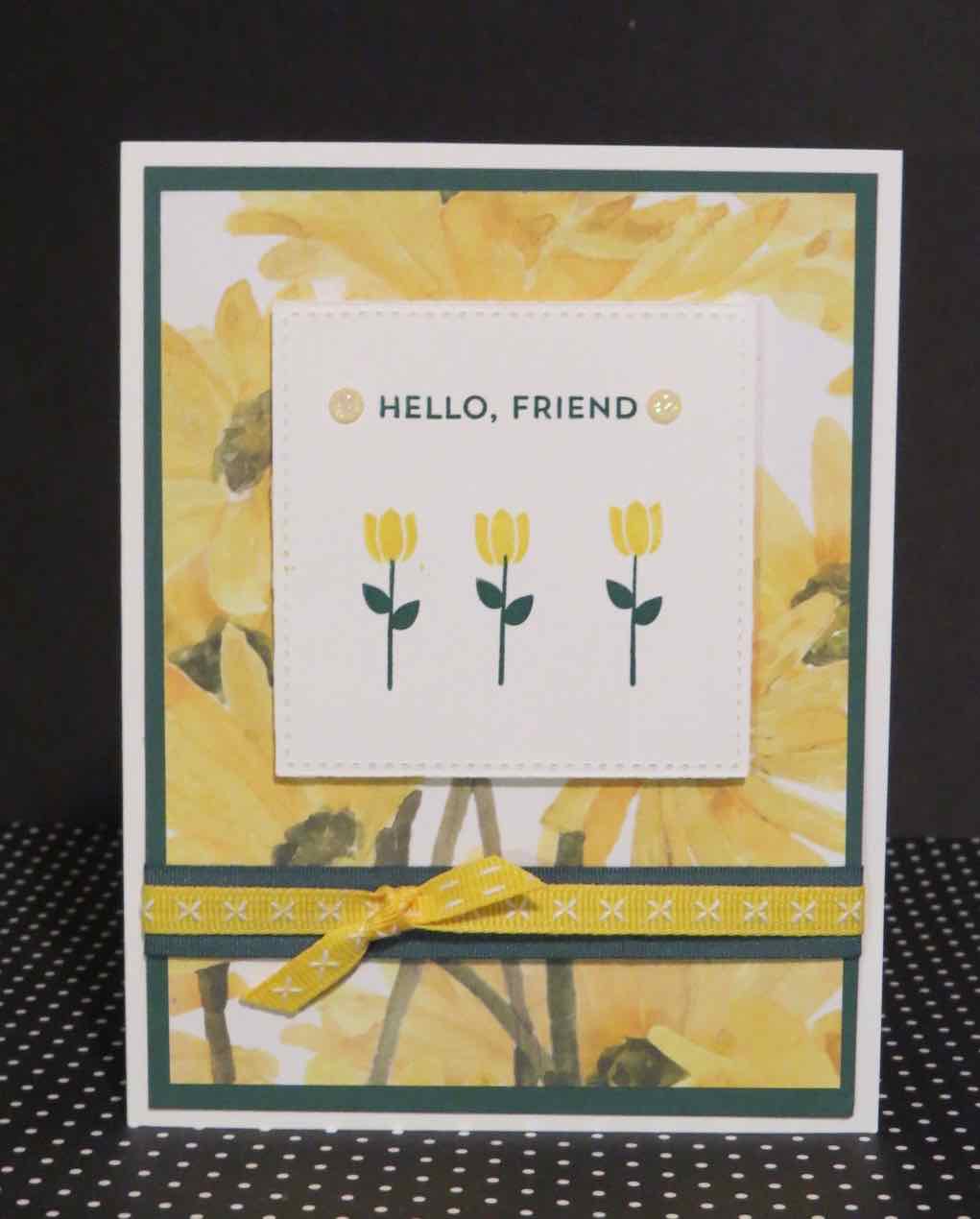 I also used Delightful Daisy Desigenr Series Paper #144137, Stitched Shapes Framelits #145372, Tranquil Tide 1/2″ Finely Woven Ribbon #144136 , Daffodil Delight 1/4″ Double Stitched Ribbon #144116 and Glitter Enamel Dots #144200.