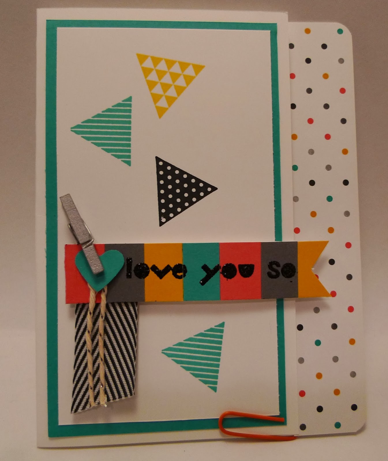 I love how she attached colored strips of card stock to Whisper White card stock and created a fun pennant shape. She embossed the greeting in Black embossing powder. Wow!!!