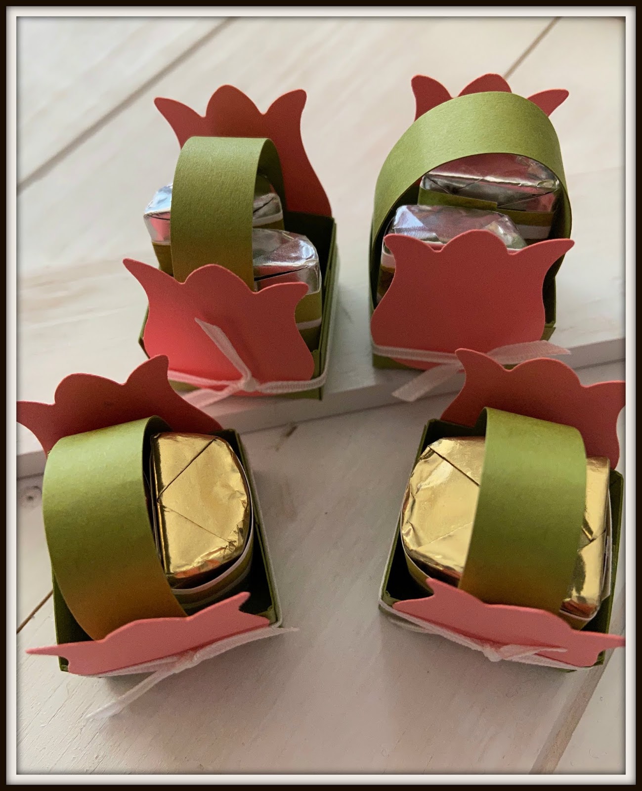 The box is 2-2/3″ x 2-3/4″, the handle is 1/2″ x 4″ and to wrap the Hershey nuggets, you need 1″ x 3″ designer series paper.