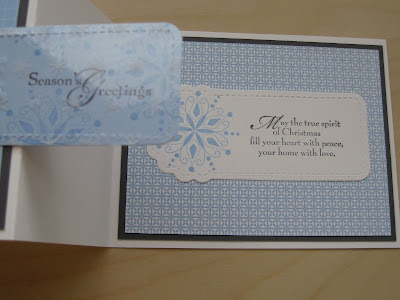 It uses the Big Shot Die Cut Machine and the Stampin’Up Two Tags Bigz Die to cut the tag. The tag was cut out of Bashful Blue and Whisper White card stock, and the SnowFall printed window sheet. The Snow Swirled stamp set was used to decorate the tags and the greetings. The card stock colors are Whisper White, Basic Gray and Bashful Blue Patterns Designer Paper. The snowflake was punched out of Vellum card stock with the Jumbo Snowflake punch.