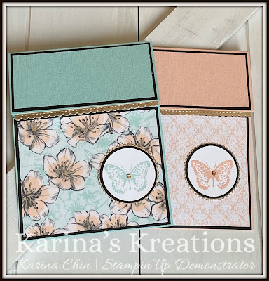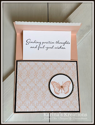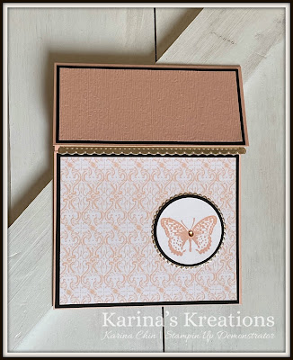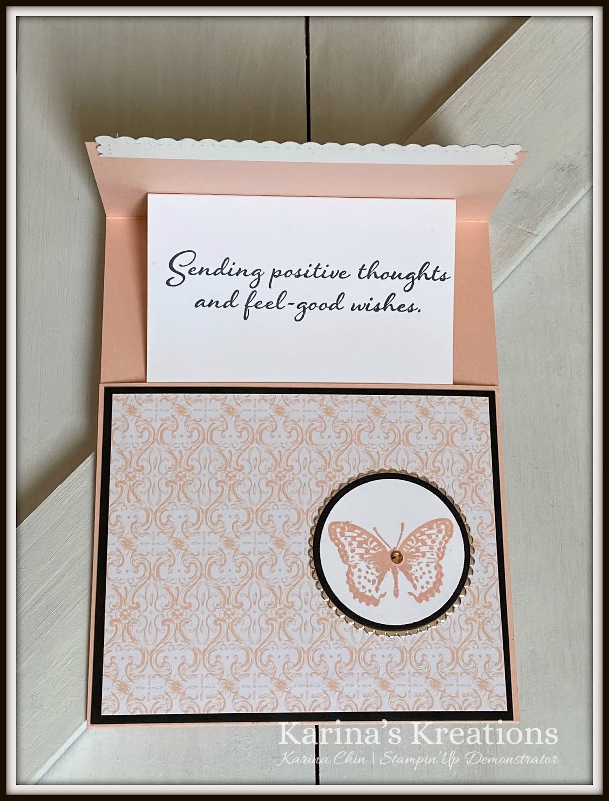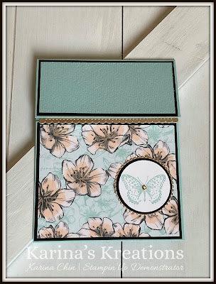 To make this card start with 4-1/4″ x 11″ card stock scored at 3-1/2″ and 9″. The inside Whisper White card stock piece is 3-1/4″ x 4-1/2″ scored at 1/2″ on the long side which is where you place your adhesive.