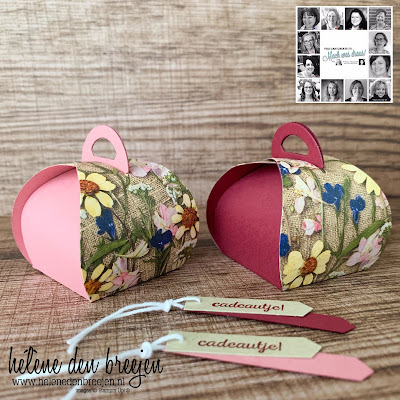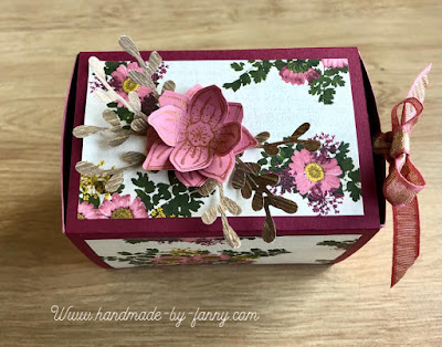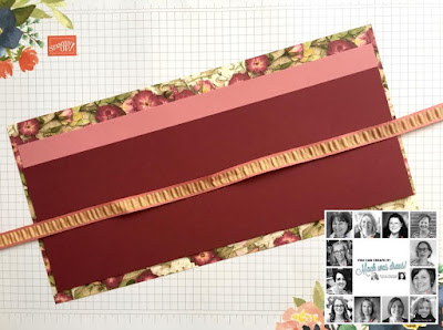 My gift card holder is made with a folded Copper Dotted Treat Bag. Just wrap some Designer Paper around the bag, add some ribbon and a sentiment to a 3-3/4″ x 3-3/4″ piece of Rococo Rose card stock. Decorate as desired.